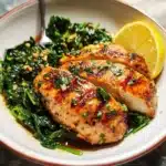 We create a zesty, aromatic marinade with fresh parsley, garlic, oregano, and smoked paprika that not only tenderizes the chicken but also infuses every fiber with incredible flavor. The chicken is then pan-seared to create a beautiful, caramelized crust while keeping the inside perfectly moist and juicy. Paired with a side of simple, elegant sautéed garlic spinach, this meal is a beautiful study in contrasts: the bold, zesty chicken against the earthy, mellow spinach. It’s a naturally low-carb, high-protein, and gluten-free dish that feels like a gourmet experience but is easy enough to pull off on any night of the week.