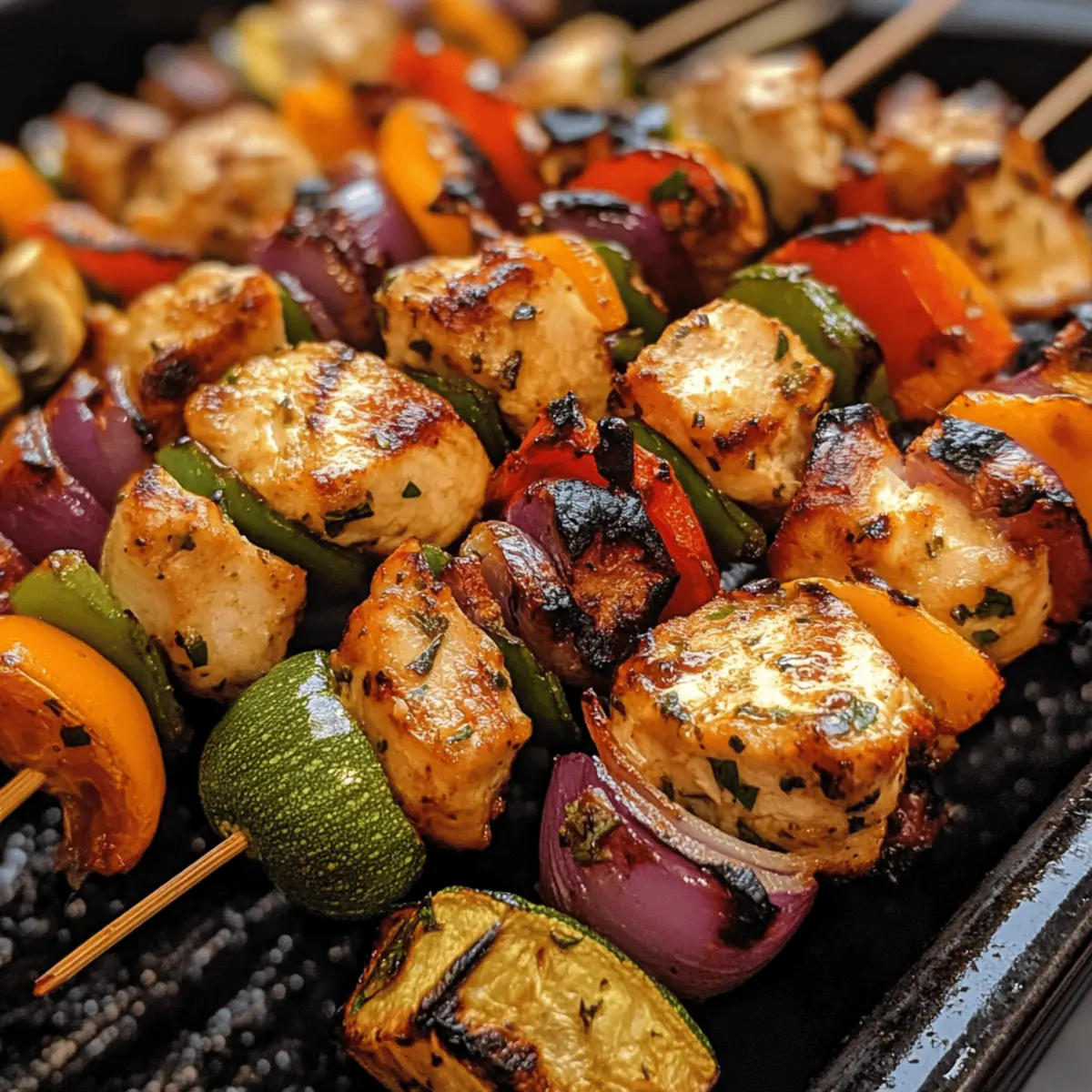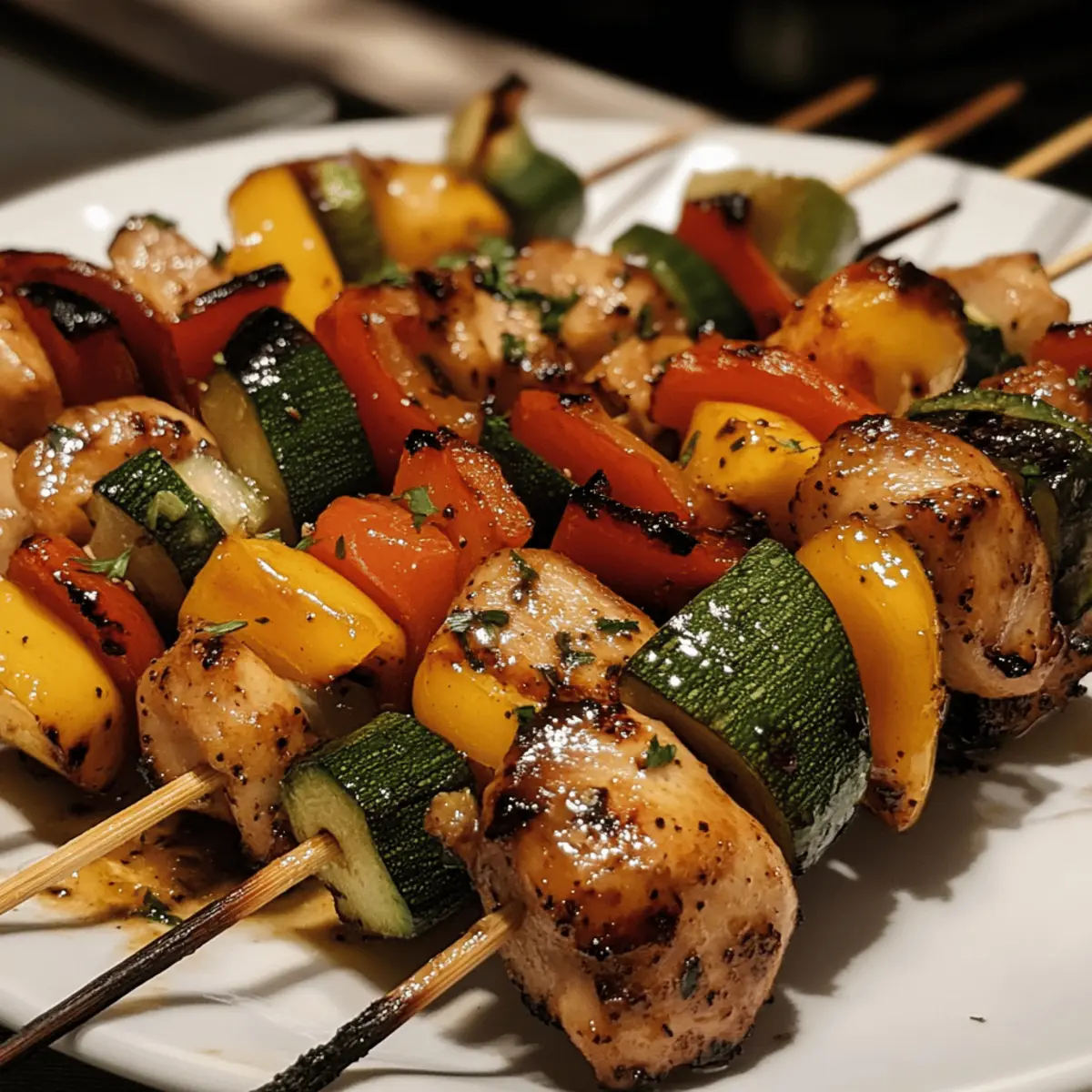 - Grill skewers for 12–15 minutes, turning every 5 minutes until chicken is golden and veggies are charred.