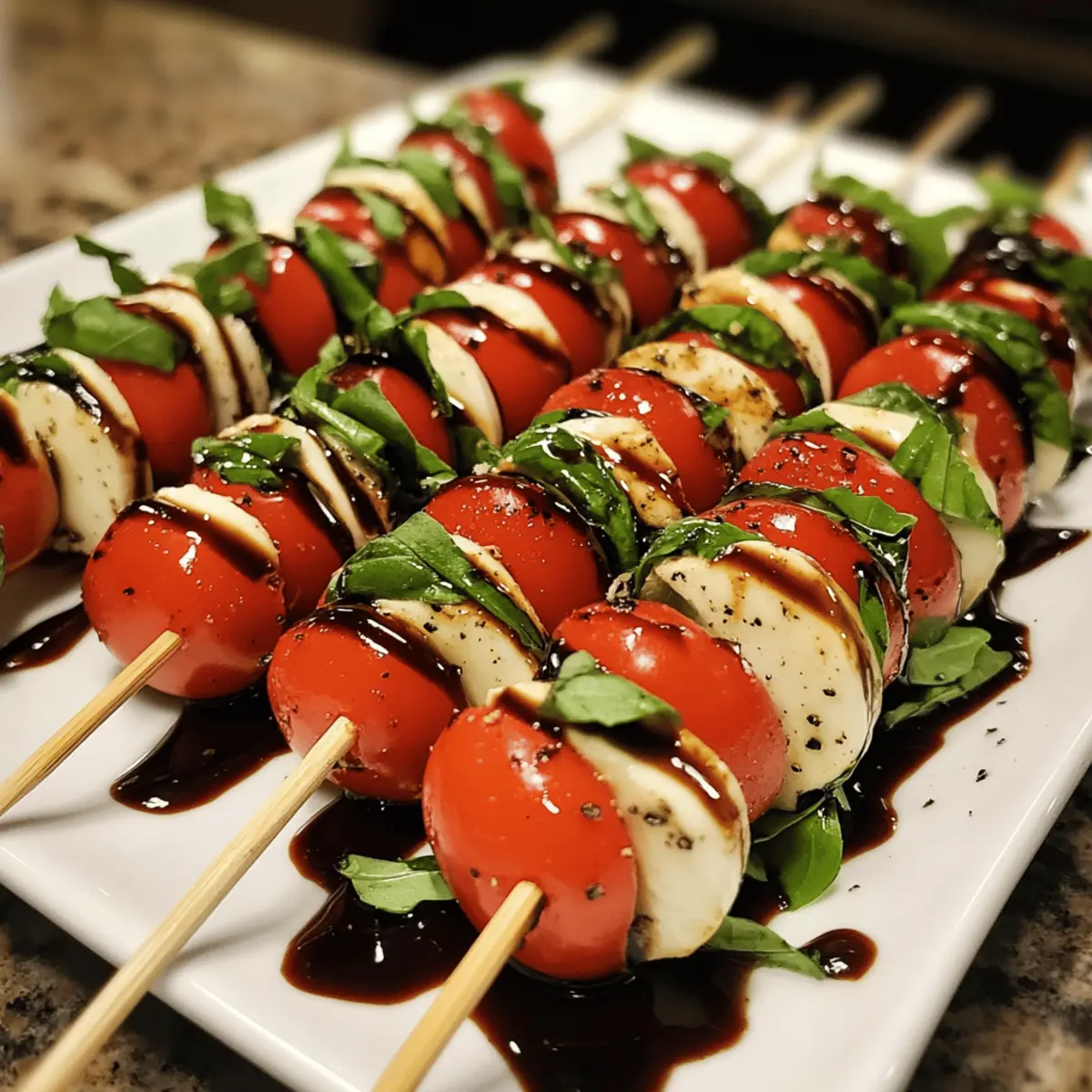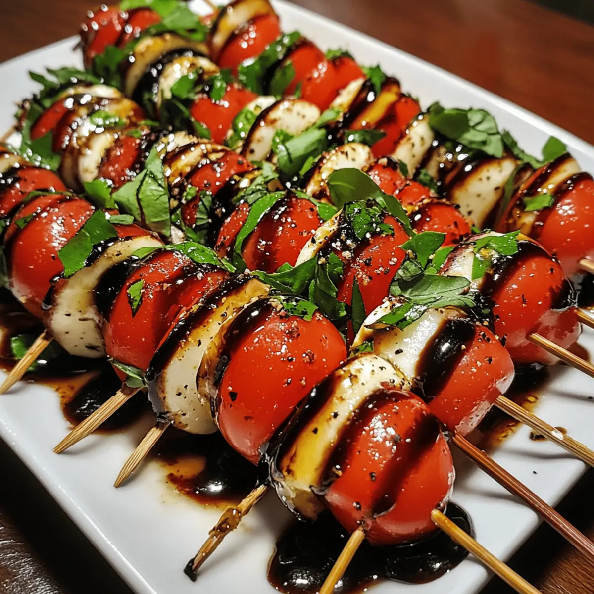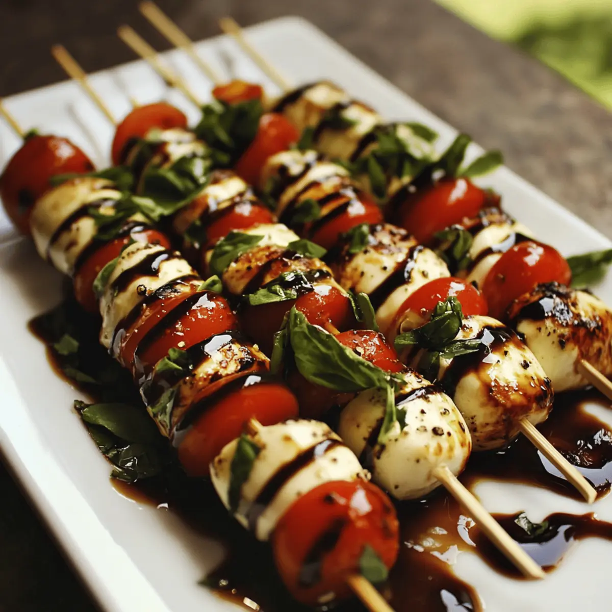 - Drizzle Glaze: Allow the balsamic glaze to cool slightly, then gently drizzle it over each skewer in a zigzag pattern, adding glossy, tangy sweetness without overpowering the fresh flavors.