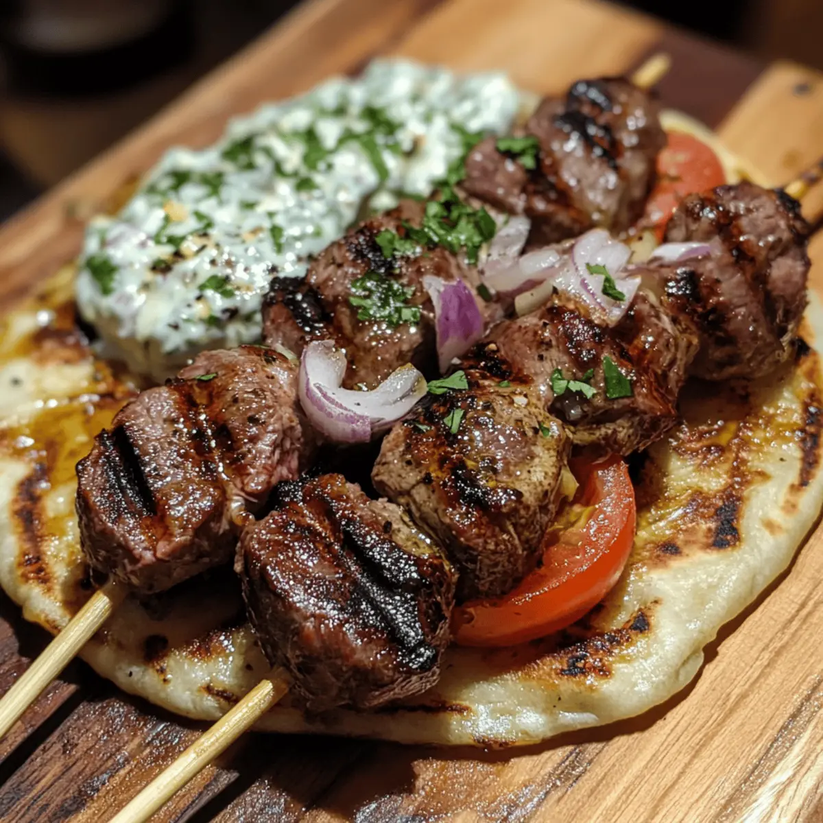 - Rest and Serve: Transfer skewers to a platter, loosely cover with foil, and let rest 5 minutes. Serve with warm pita, tzatziki, tomato wedges, onion slices, and fresh parsley.