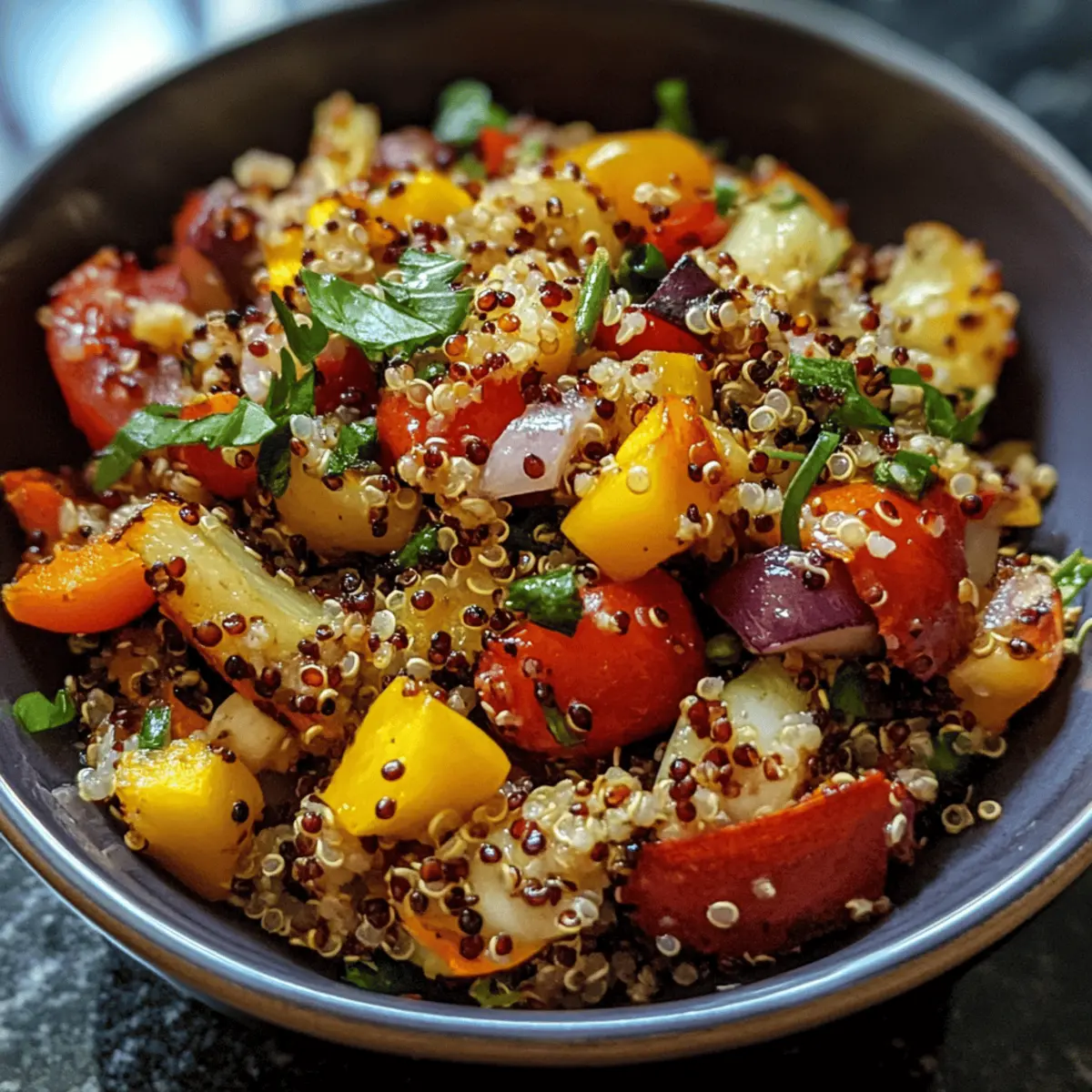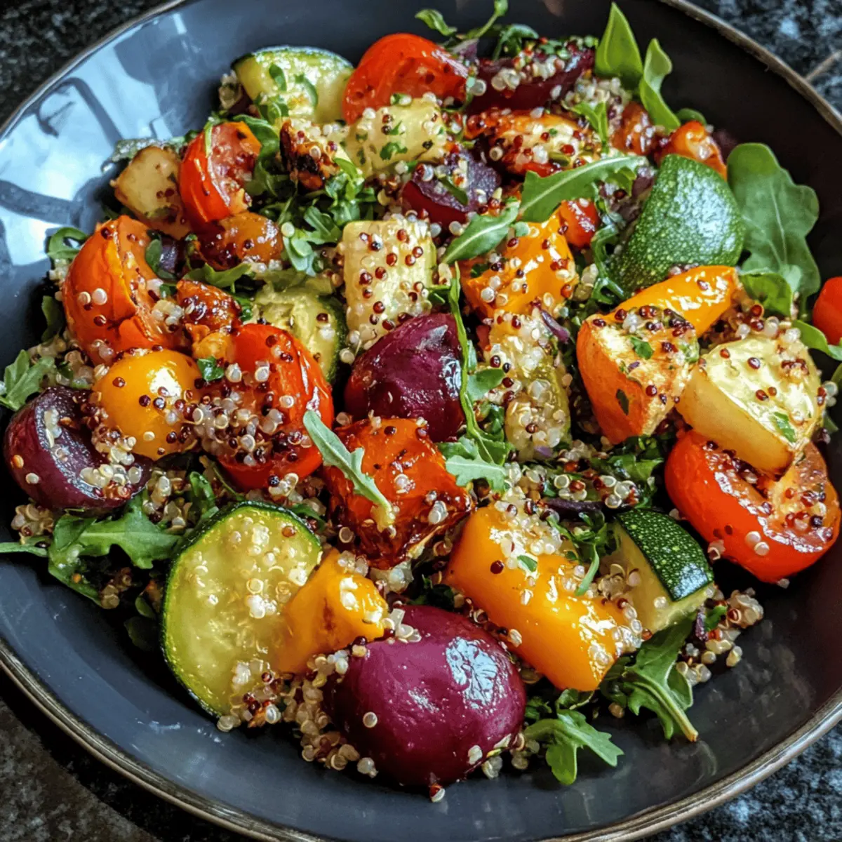 Store your quinoa and roasted veggie salad in an airtight container in the refrigerator for up to 3 days. Keep the dressing separate if you can; this helps maintain the vibrant texture of the roasted veggies. When ready to eat again, you can toss the salad with fresh dressing to revive its bright flavors.