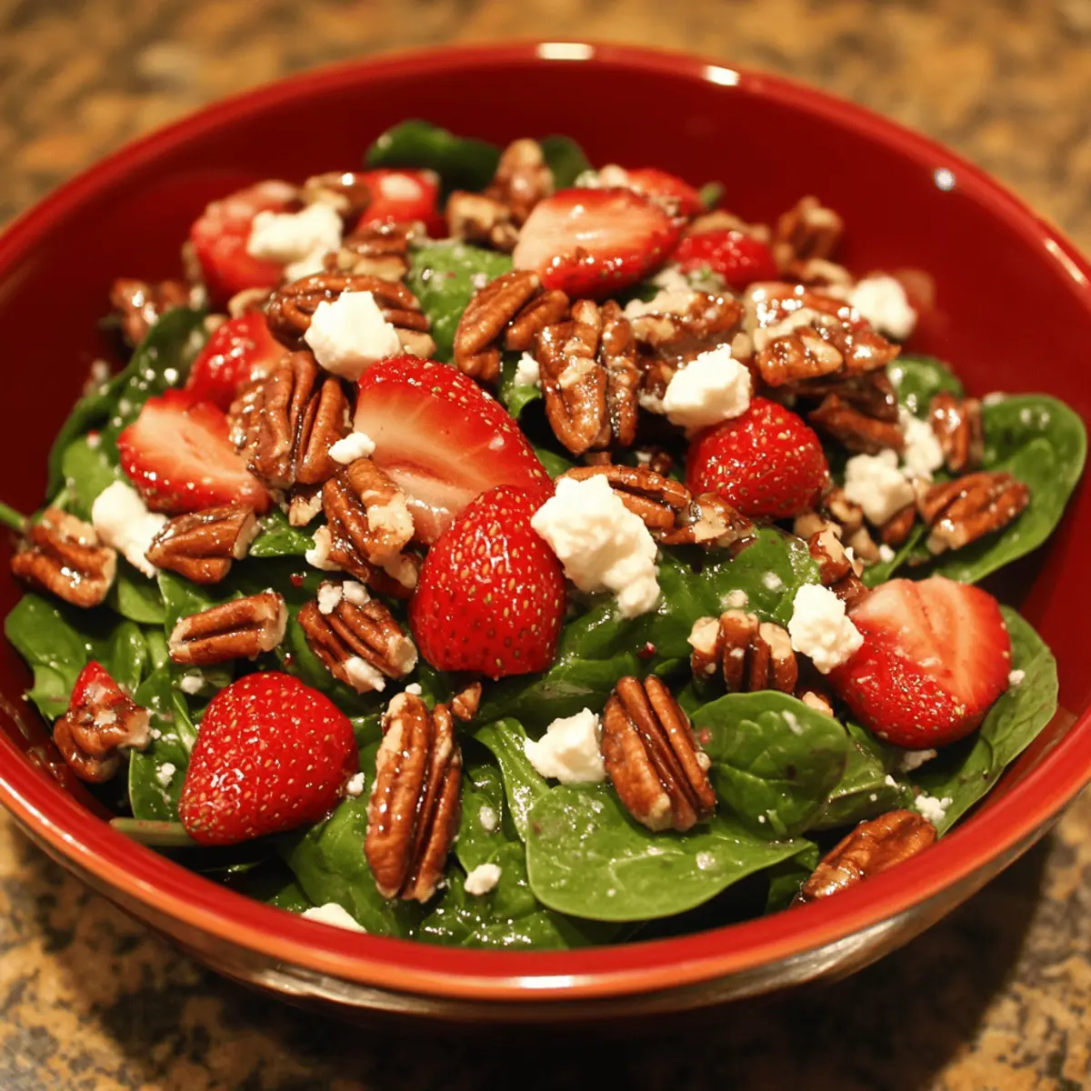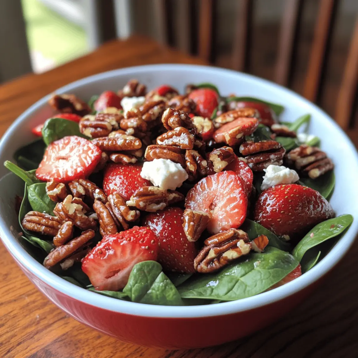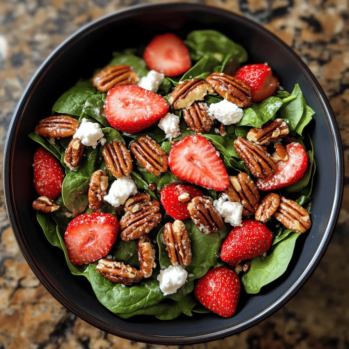 Freshness that pops: Juicy strawberries and crisp baby spinach create a vibrant base. Perfect crunch: Candied pecans add a sweet, crunchy contrast that keeps every bite exciting. Creamy indulgence: Tangy goat cheese balances the sweetness with rich creaminess. Quick & easy: Ready in minutes, ideal for busy nights or last-minute guests. Versatile delight: Pairs beautifully with grilled meats or stands alone as a light meal.