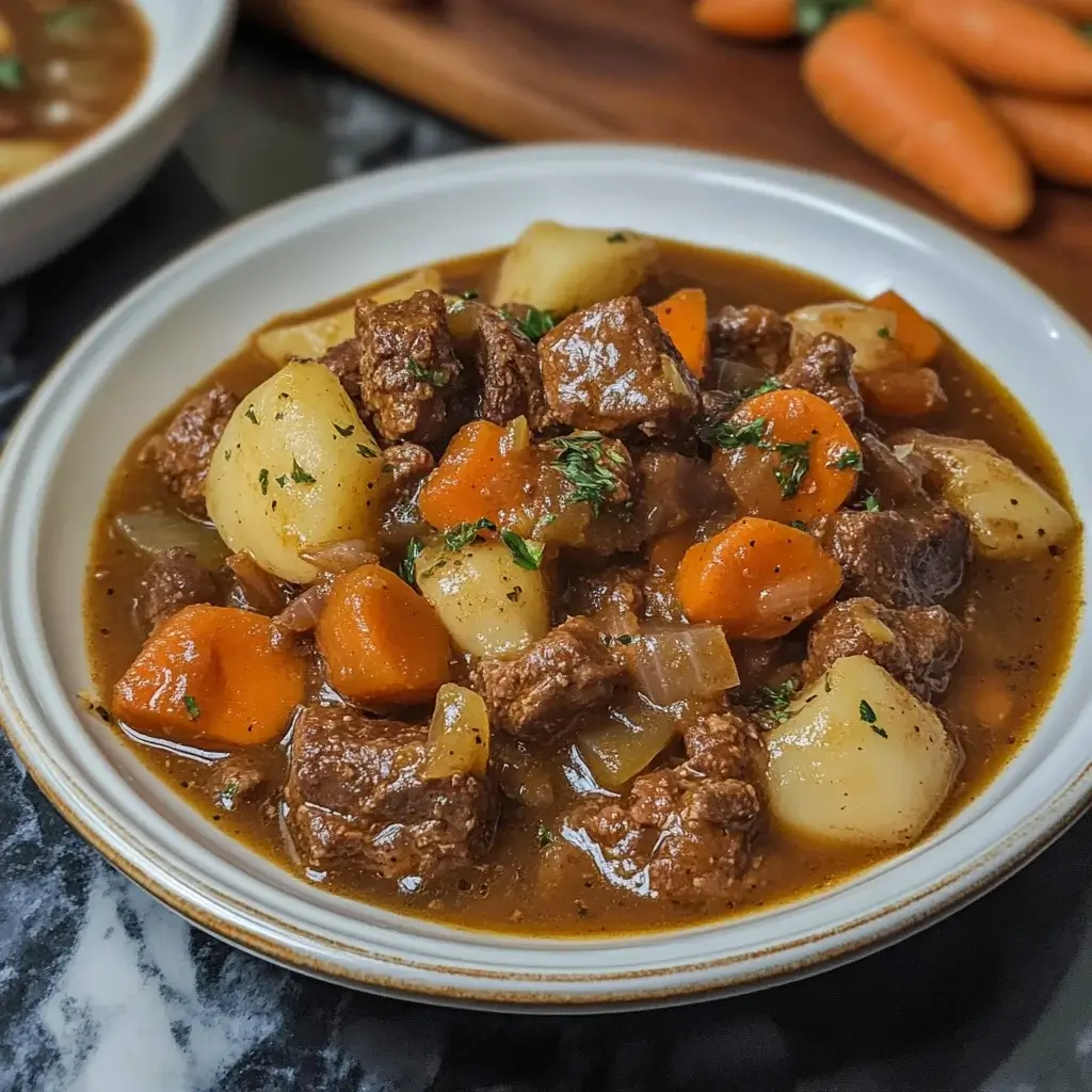 - Combine and Serve: Pour the thickened gravy over the beef and vegetables in the serving bowl. Garnish generously with fresh chopped parsley and serve hot.